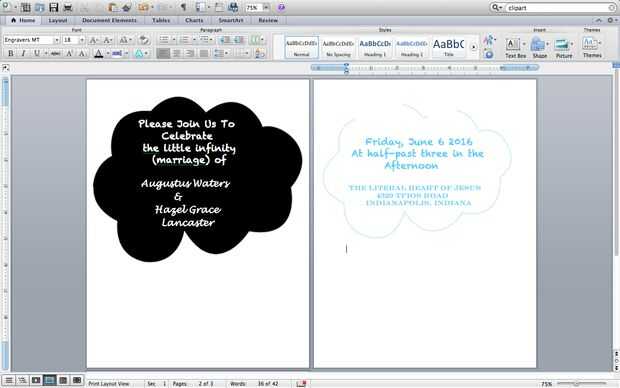 En Microsoft Word o si lo desean a mano dibujar, copiar y pegar una imagen de la nube TFIOS blanco y negro. Tengo mis nubes de Google. Si escribes en plantilla de la nube de La culpa en nuestras estrellas , debería aparecer un montón de fotos. Usé la nube negra por la parte de "anuncio" y la nube blanca por la fecha, información y ubicación. La fuente para la localización y el anuncio es Chalkduster. Es similar a la fuente del título del libro TFIOS. La otra fuente fue Graba MT. Puede utilizar cualquier fuente cursiva elegante para nombres Hazel y Gus. Yo jugaba con los tamaños de la nube hasta que fui feliz con ellos. Las nubes terminaron encima de ser alrededor de 6 pulgadas de ancho y 3 pulgadas de alto.