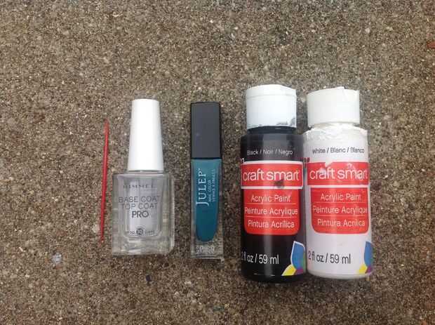 Sí, pinturas de acrílico son perfectamente seguras mientras tienes una capa de esmalte de uñas por debajo. Me gusta usar acrílico pinturas porque se secan mucho más rápido que el esmalte de uñas, son más fáciles de trabajar con, son extremadamente opaco, lavar apagado con agua y son muy barato (50 centavos por botella). Si no tienes las pinturas de acrílico se puede utilizar esmalte de uñas blanco y negro.
