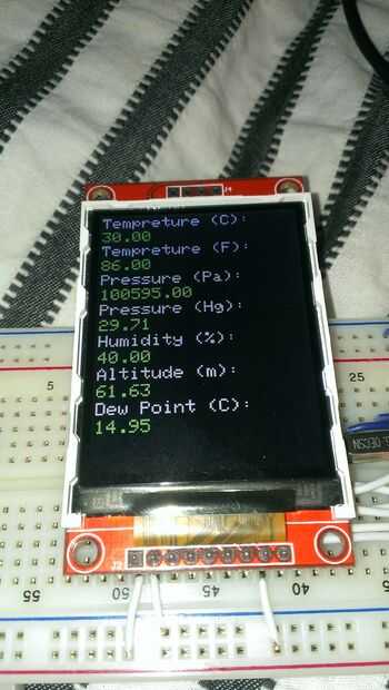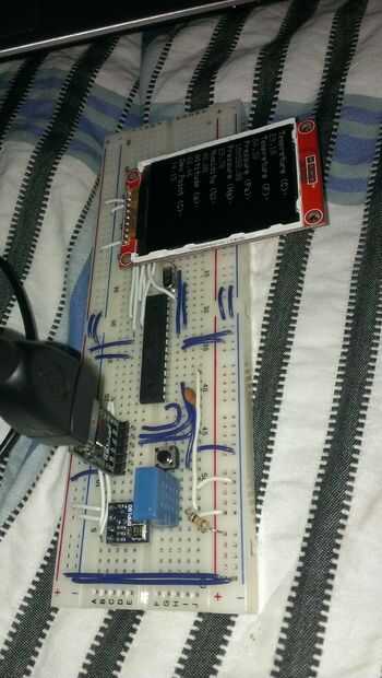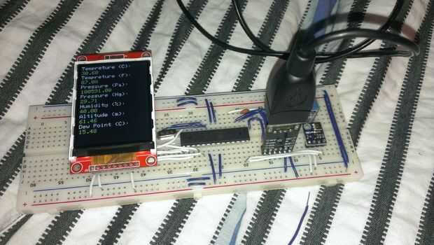 Utiliza un atmega328p-pu los cerebros y los sensores DHT11 y BMP180 así como una TFT de 2,2 pulgadas.