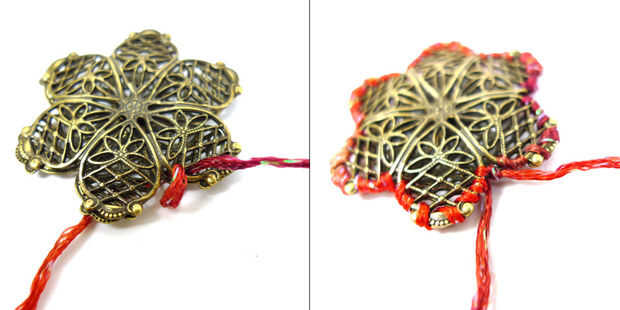 Encajar ambas piezas de filigrana junto, espalda con espalda. Pase el hilo a través de dos filigranas en el borde y atar el hilo a la filigrana, dejando una cola de 2" en el hilo. Usando el extremo más largo de la seda, los encajes alrededor del exterior de la filigrana, pasando el hilo por el borde de la filigrana como vas a colocar las dos piezas. Cuando ha atado todo el camino alrededor del borde de la filigrana atar ambos extremos del hilo en un nudo. Si lo desea, añadir un punto de pegamento en el nudo antes de cortar los extremos.