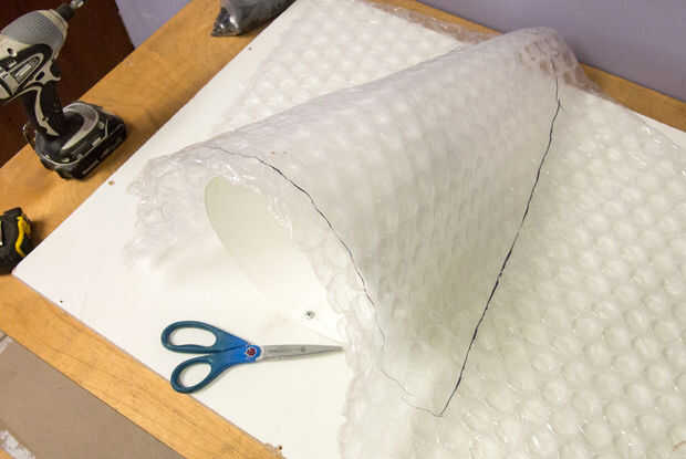 Marque la forma aproximada con un marcador y luego cortar el abrigo de burbuja con tijeras. Hacerlo una segunda vez para que tenga dos piezas de plástico de burbuja que son aproximadamente del mismo tamaño.