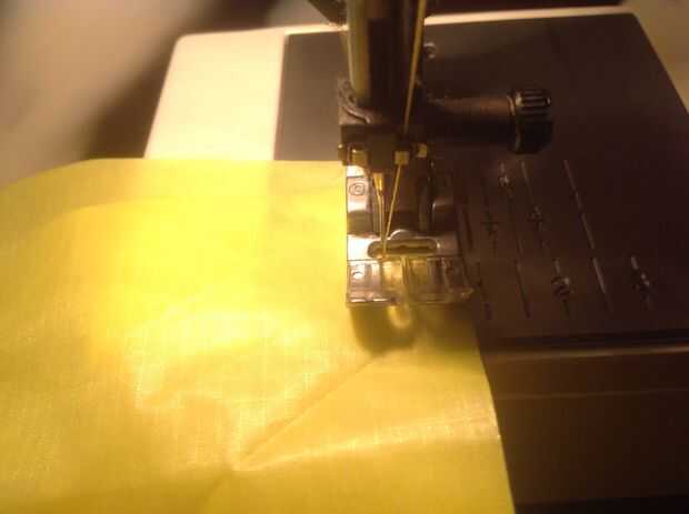 El borde de los paneles están marcados con un O o un. Que lugar O en el I. (ver foto) Compruebe la posición de la aguja. (ver imagen) La mayor parte de la cometa debe estar en el lado izquierdo de la máquina. Durante la costura siempre Alinee el borde de la tela con el lado derecho del pie máquinas de coser (véase el cuadro). Colocación de la posición de la aguja a la derecha hace una costura de 1cm de ancho. La longitud de las suturas entre 3 y 4 mm. empiece a coser, colocar el hilo, seguro por ir hacia adelante y hacia atrás. Amarre por hacer lo mismo. Ni que decir, hay un botón especial en su máquina para hacer esto...