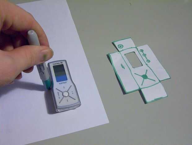 colocar el elemento de elección en el papel y cuidadosamente traza alrededor de él. Añadir los lados, para que cuando usted corta, se dobla alrededor del objeto para formar una cubierta de fondo abierto. Esta es la primera parte del patrón. Tenga en cuenta cualquier botón o puertos que desea interactuar con en el patrón.