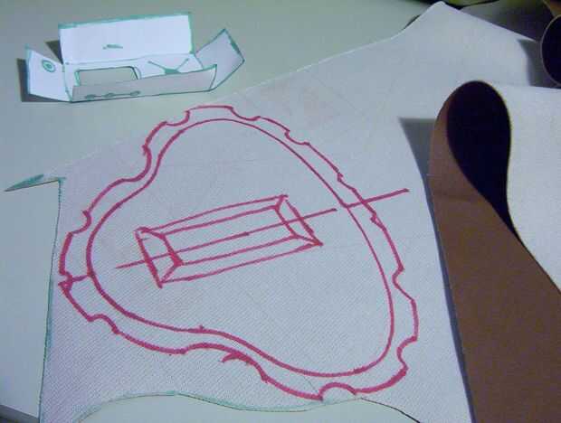 También, en su línea central, colocar el primer bit del patrón que hicimos para el objeto. Doble los lados hacia arriba y a trazar el contorno básico del objeto. Luego, dibuja líneas en un ángulo de 45 grados que va hacia el interior de las esquinas de esta forma. y para hacer otra frontera de superposición. Este será el agujero que podemos usar para insertar o extraer el objeto a voluntad.