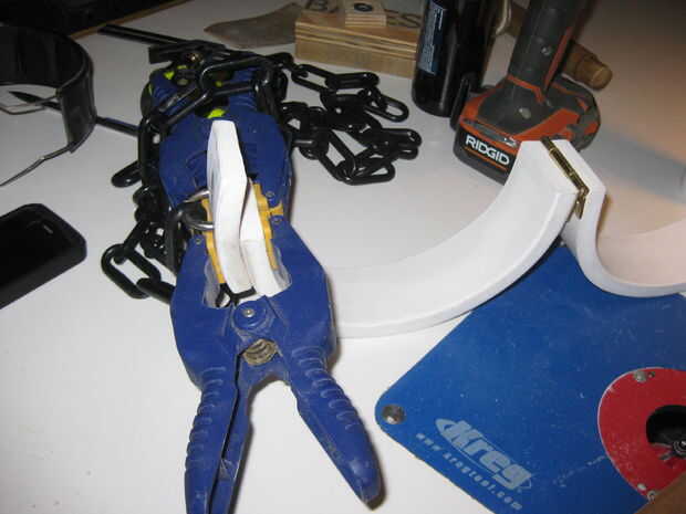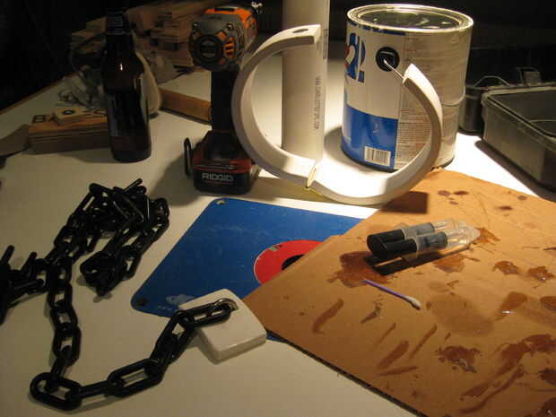 Materiales: ½" láminas de PVC, ¾" Junta moldura de PVC 20 pernos, anillo de metal, cadena plástica, bisagra de la puerta pequeña, dos tierras raras imanes, primer, pintura en aerosol y spray de laca.