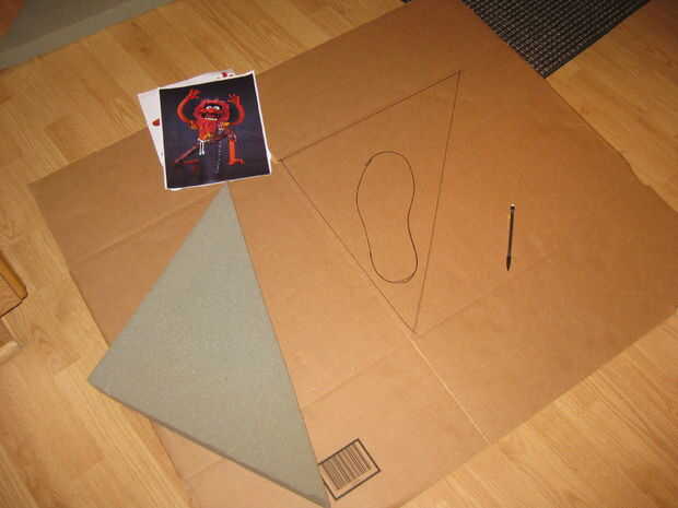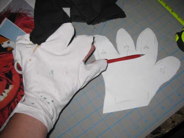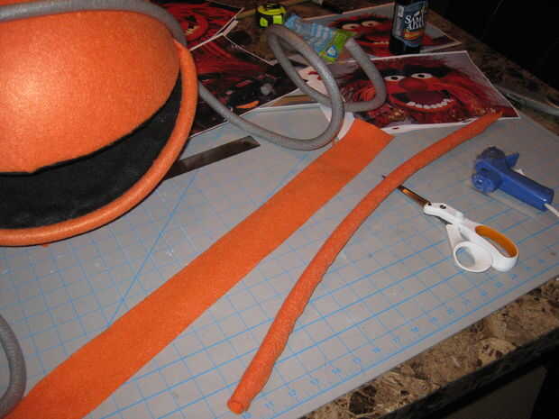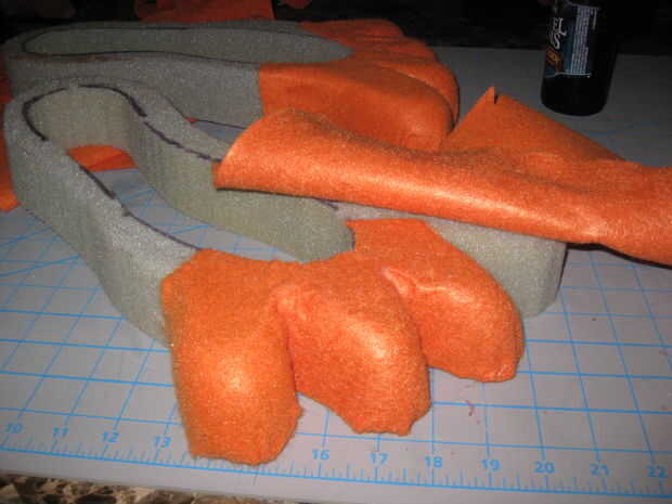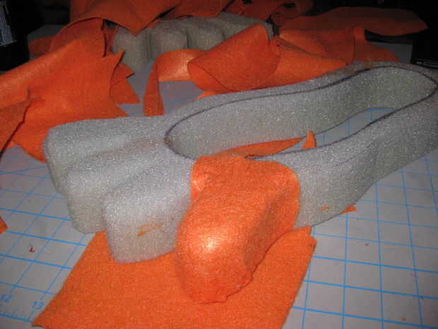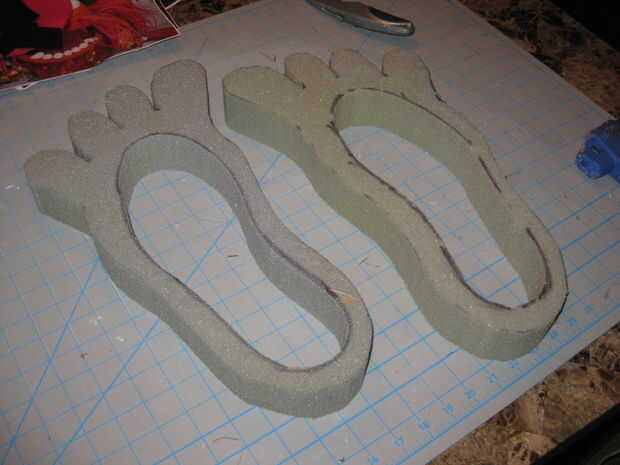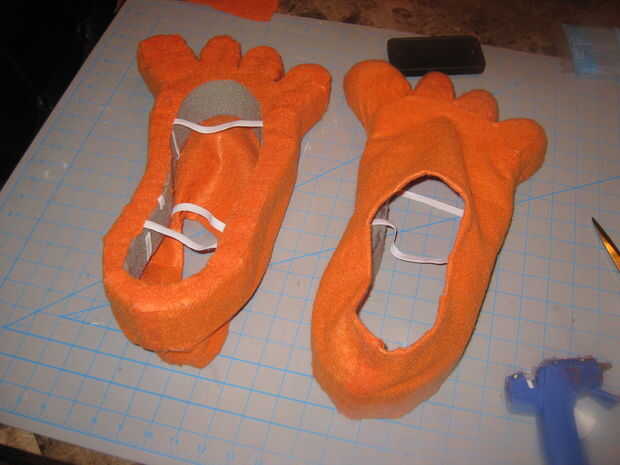 Fabricación: Los pies se hicieron de espuma densa de un cajón de embalaje. Caben alrededor de mis zapatos y longitudes de elástico fueron utilizados para evitar deslizamiento de los zapatos. Cada dedo del pie era piel con fieltro individualmente para mantener tan suave como sea posible, y luego el resto del pie fue cubierto con un pedazo grande de fieltro con una costura en la parte posterior del pie.