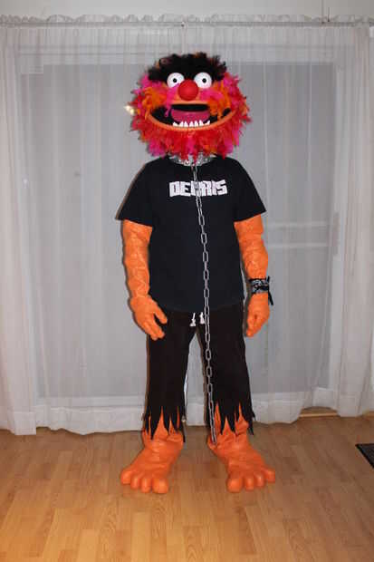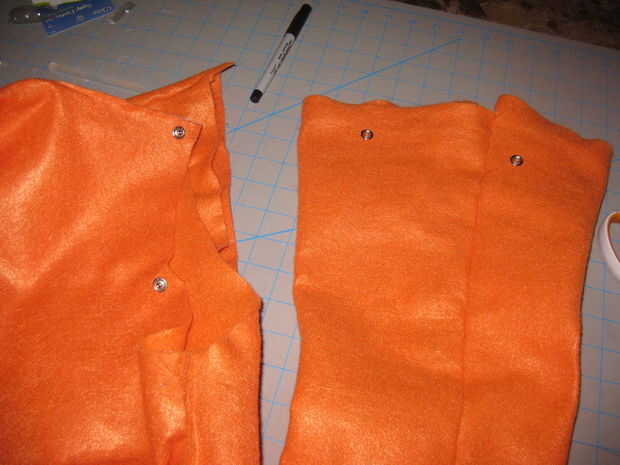 Fabricación: he creado una plantilla de cartón para la parte delantera del cuerpo y hacia atrás, así como una plantilla para el brazo, mano. Una vez que se corte el fieltro, me uní a las piezas con pegamento caliente porque tenía mejor que mis conocimientos de costura deficiente. Broches de presión estaban pegados a la subsistencia, el chaleco cerrado. Unos broches fueron utilizados para sostener los brazos para el chaleco y evitar que resbale hacia abajo. Tubos simples con una costura fueron hechos para las piernas y pegados en los pantalones. Los pantalones son una compra de buena voluntad y se llevan a cabo para arriba con una longitud de la cuerda como un cinturón. La camiseta es de mi armario.