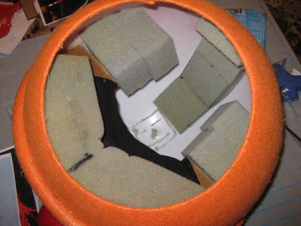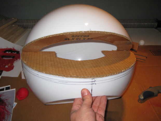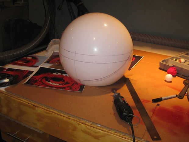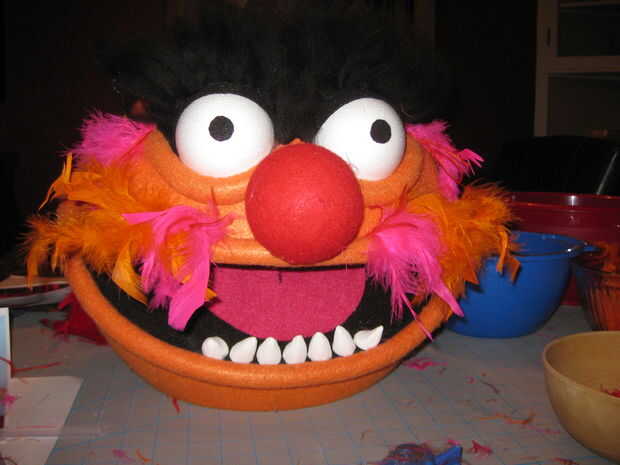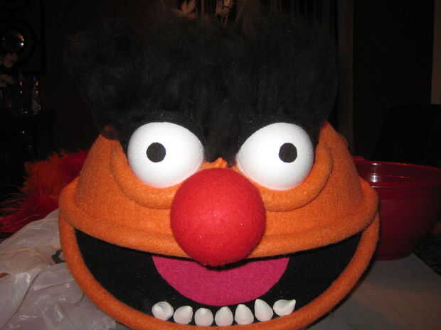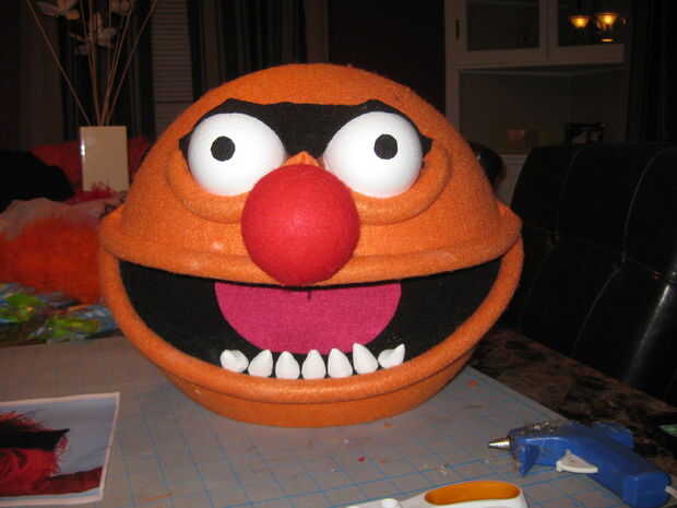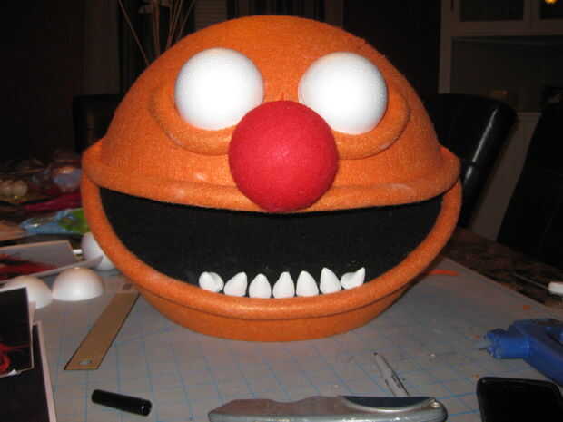 Fabricación: empecé con un globo de plástico que se encontrar en postes de la lámpara de patio. He agrandado el agujero inferior de mi cabeza y cortar la boca utilizando una Dremel con un disco de corte. El interior de la boca fue formado con cartón y con pegamento caliente. A continuación, la cabeza fue desollada en fieltro, que negro y rosa sentían por el interior de la boca y la lengua respectivamente. Labios y el párpado inferior fueron realizados por envoltura tubular espuma (caulk saver) en fieltro y luego pegando en la cabeza. Para la nariz, he utilizado una pelota de espuma de poliestireno de 3" de piel en rojo fieltro y une con pegamento caliente. Los globos oculares son 2 ½" bolas de espuma de poliestireno con un tercer corte en la Sierra de cinta para que se vea puesto en la cabeza. Para el párpado superior, he utilizado fieltro negro, y para las cejas, solía falsos bigotes. Los dientes están hechos de más ¾" tablero del PVC acabado, que se forma sobre la lijadora oscilante y con más pegamento. El último paso fue la laboriosa tarea de pegado en plumas de pollo y pavo, que fueron adquiridas por disección varias boas de plumas. Para mantener la cabeza de moverse en mi cabeza, yo más de la espuma rescatada y pegamento caliente en el consiguió un apretado y ajuste cómodo. Hay una sección de la tela de malla negra en la parte posterior de la boca, que soy capaz de ver a través.