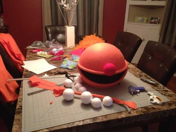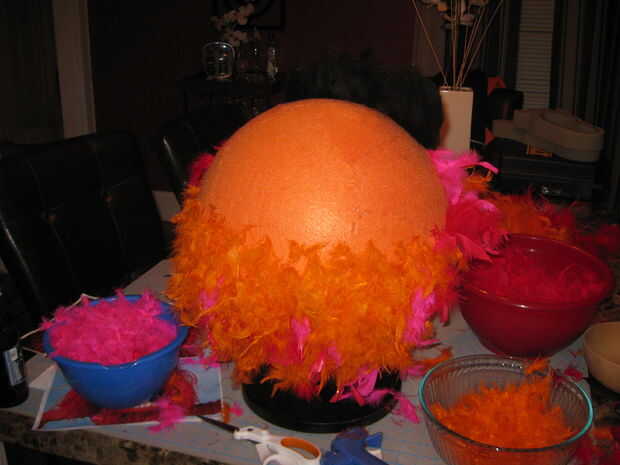 Materiales: Globo plástico, fieltro, malla de tela, tablero guarnecido de ¾" del PVC, pelotas de espuma de poliestireno, boas de pluma, dos bigotes falsos y pegamento caliente.