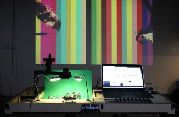 Este proyecto es una plataforma para capturar, manipular, y clips de video proyección en vivo para un funcionamiento de la etapa. Utilizando una miniatura greenscreen syke, algunas cámaras Web, algunos juguetes de cuerda y un montón de formas 2D, soy capaz de capturar clips de vídeo, reproduce en un bucle al instante, y clave fuera el verde fondo a compuesto les proyección durante una actuación en vivo.