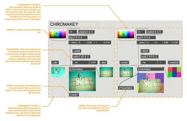 El patcher se explica bastante ampliamente en la imagen de descripción. Básicamente, hay dos niveles de chromakey. Nivel 1 compuestos dos capturaron clips de vídeo que se envían desde los patchers clipControl y clipPlayer. Este nivel de salidas de un compuesto de dos clips al nivel 2, que a su vez le permite clave hacia fuera el fondo verde con el compuesto de modo que la matriz de ruido se convierte en el fondo general.