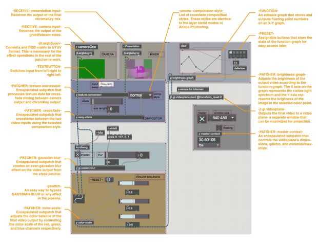 Este patcher toma la salida de chromKey y funciona a través de una serie final de efectos antes de que se proyecta. Con este patcher, puede cambiar la salida de la cámara de entrada (a partir de cualquier cámara es seleccionado en grabWebcam) a la entrada de la película (de chromaKey).
