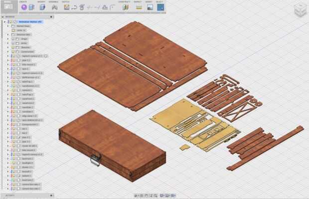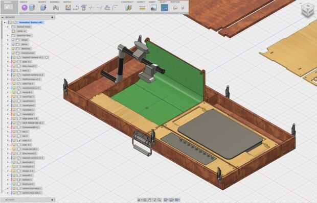 Diseñé la estación que lo que típicamente se llama un "caso de ataúd", lo que significa que todo el equipo está conectado a la parte inferior de la mitad de la caja y la tapa se puede quitar en conjunto. Usé la fusión 360 para diseñar todo el proyecto porque es un programa de modelado de gran alcance es fácil de salida geometría 2D de un objeto 3D para corte por láser.