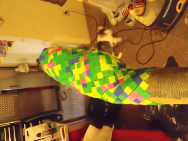 A continuación corte 3/4 plazas y cubiertos los brazos desde el hombro hasta medio antebrazo, las plazas son espuma de artesanía y pegan en caliente.