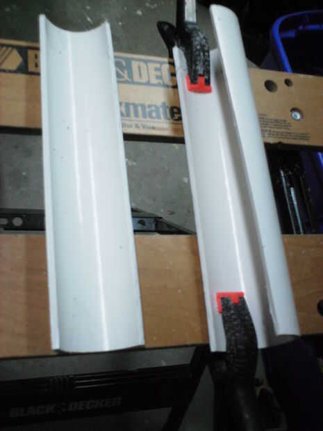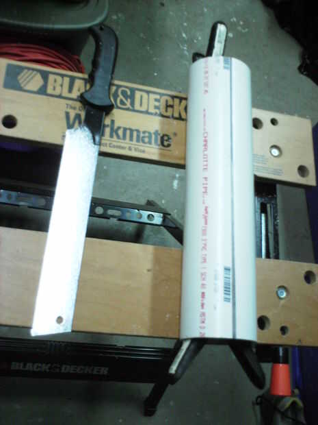 Consigue un trozo de PVC masivo, amplia. Corte a la longitud, dejando aproximadamente una pulgada entre el PVC y los corredores en ambos lados. (Así será dos pulgadas más corta que el espacio entre los tableros corredor.) Si tienes una sierra sable o un navegador, use. Hice las líneas rectas colocando la tubería en las fauces de mi compañero y ejecuta un rotulador en la superficie. Alternativamente, puede colocar el tubo sobre una mesa y recorren el Sharpie. Corte a lo largo de sus líneas. Desea dividir su pipa de terceras partes - como el tope de dos tercios, un tercio de tu montón de chatarra. :)