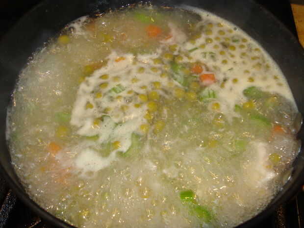la primera vez que hice esta sopa era una verdura pollo cremoso. Cada vez que lo hice seguí haciéndolo más grueso y más grueso hasta que fue como pollo pastel. Cuando añadí una lata de galletas de la nevera en la parte superior. Las galletas estén do