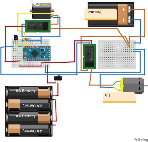 El ventilador no es problema ya que puede tener su propio secruitry y activado por el relé, el servo sin embargo obtiene su posición desde un pin PWM 9 de arduino para utiliza dos proveedores, que significa para nosotros que tenemos que tener puntos en común.