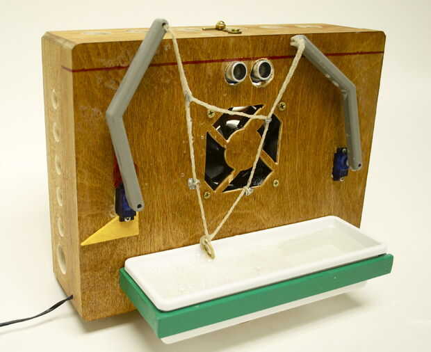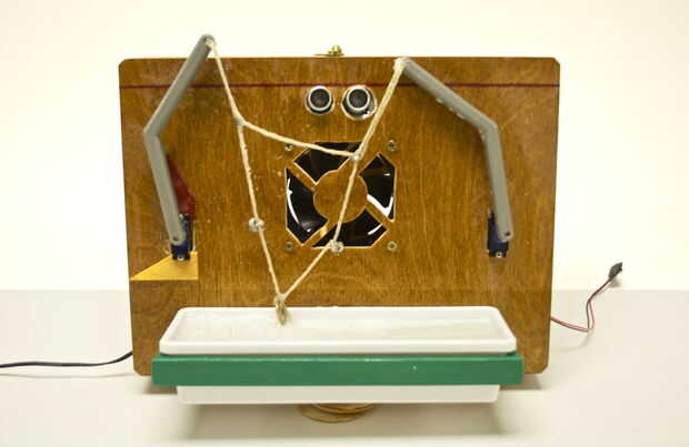 Este instructable fue creado en cumplimiento de la exigencia de proyecto de la Makecourse de la Universidad de South Florida (www.makecourse.com). Mi proyecto de diseño de ingeniería es una máquina de burbujas, sin embargo no su máquina de burbuja típica que podía adquirirse en su local de Wal-Mart. El "Pelele" utiliza el método de cuerda y palo viejo con un nuevo giro mientras que todavía produce burbujas más grandes. Por lo tanto, usted conseguirá el mismo efecto sin tener que manualmente mojar los palillos. Incluido es el sensor de movimiento proximidad de infrarrojos en que es promulgada por un transeúnte, que luego activa el mecanismo de palanca. Los servos se proceden a la cuerda de inmersión en el líquido, llevar la palanca hacia atrás hasta el ventilador que sopla que luego se 'funde' la burbuja.
