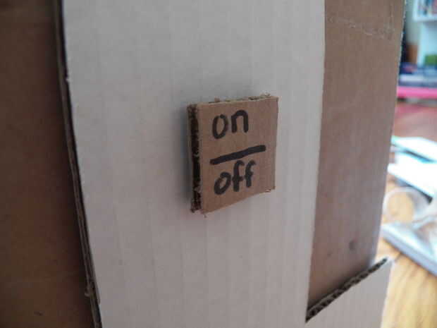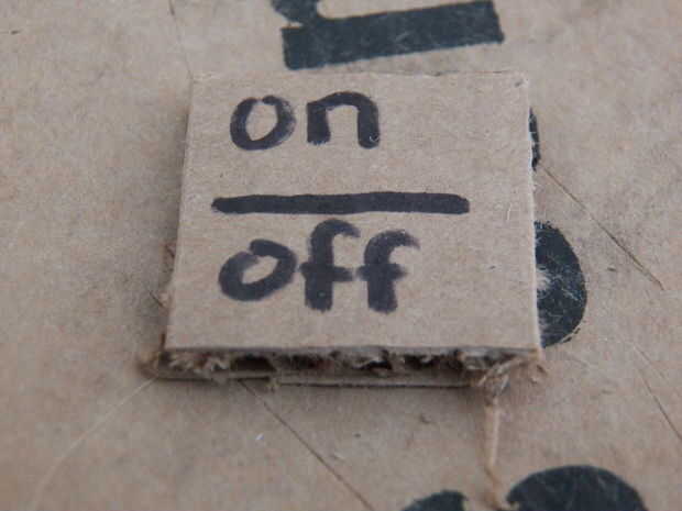 Ahora todo lo que queda es agregar un botón de encendido. Seguro que el interruptor poco funcionaría, pero no se ve muy bueno. Para hacer su botón de encendido, cortar un trozo de cartón llano 1 x 1 pulgada cuadrada, entonces se puede escribir encendido en él como hizo mina, cuadro 15, o dejarlo en blanco, usted podría realmente decorarlo cualquier forma que desee:) Ponga sólo un poco pequeña de pegamento el interruptor luego presione el botón y manténgalo durante 30 segundos, cuadro 16.