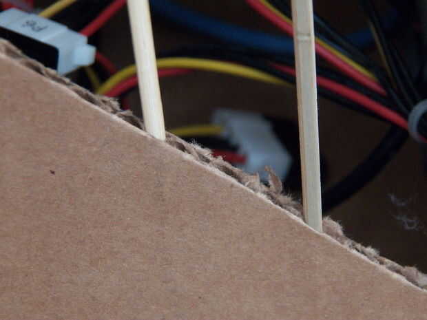 A continuación, vamos a utilizar pinchos para hacer una parrilla para mantener las manos fuera del agujero de la vista en el lado de la caja. Tomar un pincho y romperlo para que sea aproximadamente 2 pulgadas más de largo que el agujero es alto (imagen 13) entonces rompe en esa longitud. Pega abajo entre los pliegues de la cartulina en el borde inferior del orificio, luego entre los pliegues en el borde superior, cuadro 14. Si desea, puede utilizar un poco de pegamento para mantenerlo en su lugar, pero mía no la necesitaba.