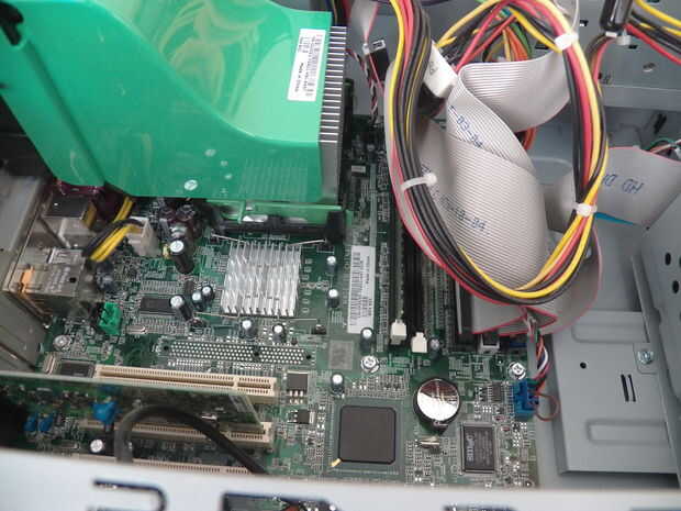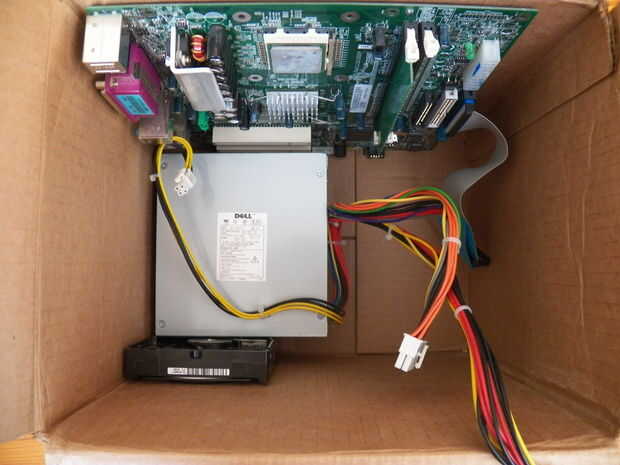 junto otra vez. Que ' la parte más difícil;) OK... bien no es tan difícil:) Tomar la la placa madre, disco duro, unidad óptica si usted decide utilizar, frente puertos si tienes ellos, fuente de alimentación y ventilador y organizar en el cuadro cómo desea tenerlos. La mayoría de ventiladores sólo tornillo o clip en la parte superior del disipador de calor de cpu, cuadro 2. Si es tuyo puede dejarla así o montarlo en la pared posterior de la caja. Tuve que mina montar en la caja, se montó en la parte posterior de la caja vieja y no pude averiguar cómo montarlo sobre el disipador de calor en. Había montado el disco derecho de una de las paredes, la placa a la otra pared y la fuente de alimentación entre ellos, con el ventilador sobre él. No encajo en mi unidad óptica o un disquete, así que he decidido no utilizarlas. Asegúrese de que sabes dónde los orificios están en todo lo se va a montar. Usted debe montar la fuente de alimentación, disco duro, y placa con tornillos, todo lo demás puede ser pegado en caliente del derretimiento. La primera foto muestra cómo decidí organizar mi componentes si necesita ideas:) La vista es desde la parte superior.