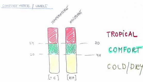 Quería crear algo que daría información más intuitiva, una mirada, con los niveles y colores. Realmente mostraría el nivel de confort, por lo tanto decidí llamarlo El metro de comodidad.