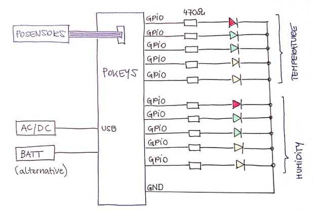 Esquema muestra cómo conectar los elementos electrónicos con PoKeys. PoSensors están conectados al conector dedicado PoKeys utilizando cable plano que viene con el módulo PoSensors. GPIOs (General propósito entradas / salidas) están configurados como salidas. La señal viaja a través de la resistencia de 470R y LEDs estándar hacia tierra (conector PoKeys). La fuente de alimentación puede hacerse ya sea sobre el convertidor AC/DC (en ese caso se necesita un adaptador de 5V con conector USB y conecte a la energía en casa enchufe 110/220 Vac) o sobre un paquete de batería de emergencia con conexión USB.