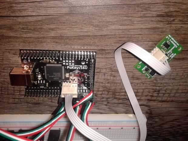 Conectar los elementos en la protoboard para probar si todo funciona. Utilice el esquema adjunto. PoKeys está disponible con o sin terminales. De prototipos no usé ninguna versión de terminales con conectores de avance. He conectado el PoKeys y el protoboard usando conectores de dupont. La Junta de PoSensors se une a PoKeys con cable plano suministrado.