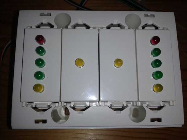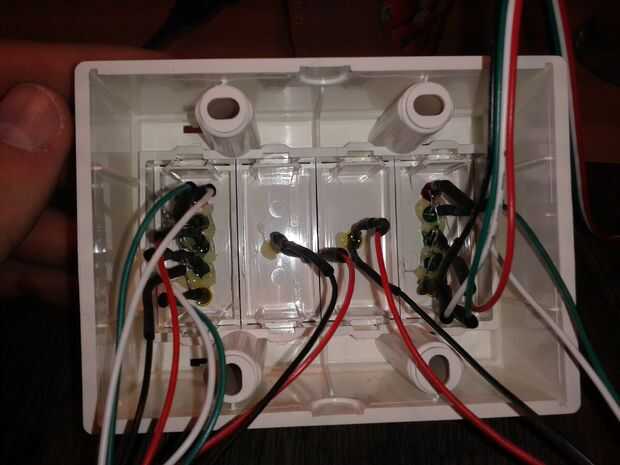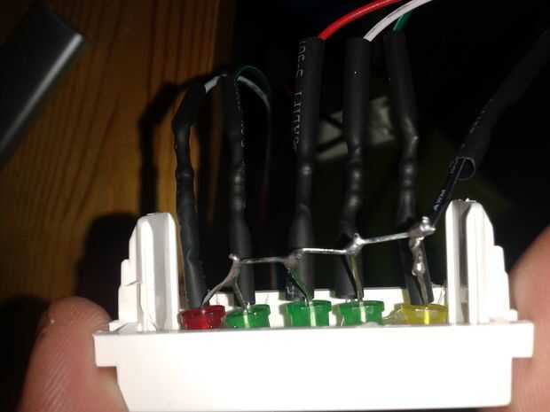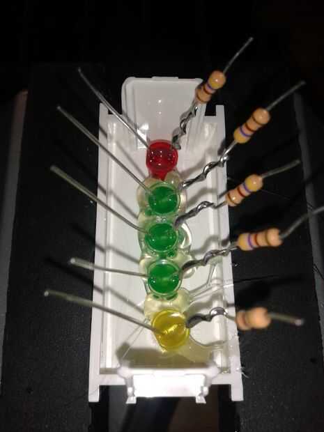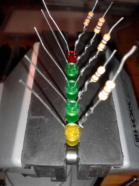 Que hecho, he puesto en los LEDs y soldar el resistor de 470 ohm al ánodo (A) lado de cada diodo. El lado de cátodos (K) iría a la tierra. He utilizado pegamento caliente para fijar los LEDs.