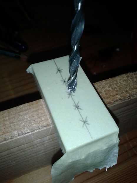 He cubierto cada módulo con una cinta que usan los pintores de pared, que se desprende fácilmente y se puede escribir sobre ella. Escribí una X donde iría un LED (7mm separados cada camino desde el centro) y utilizan un taladro de 5mm para los agujeros.