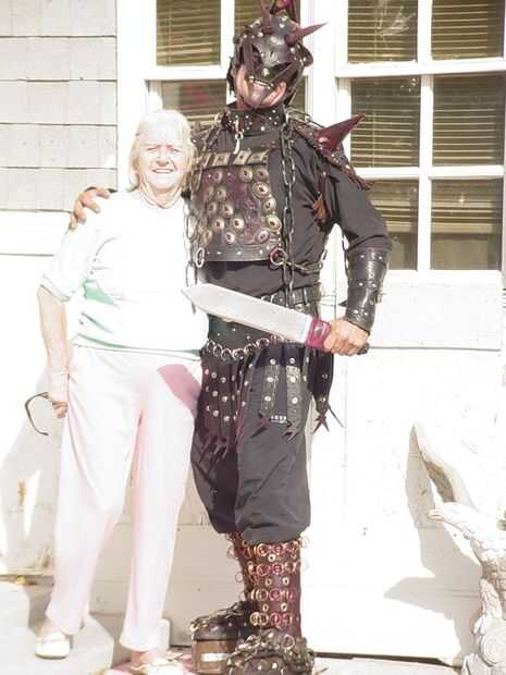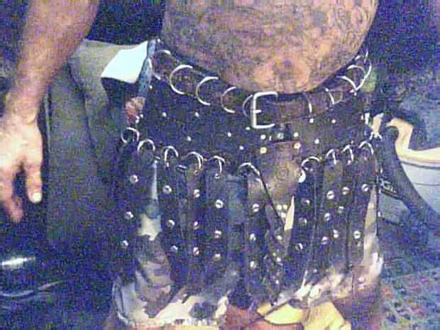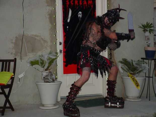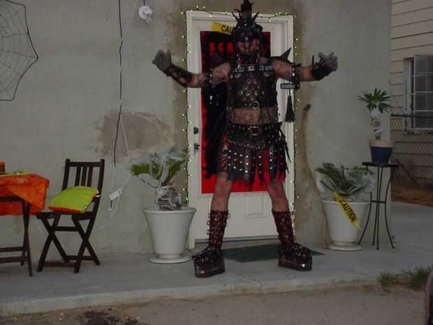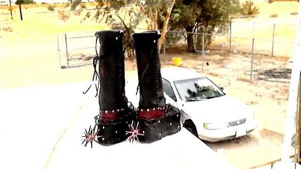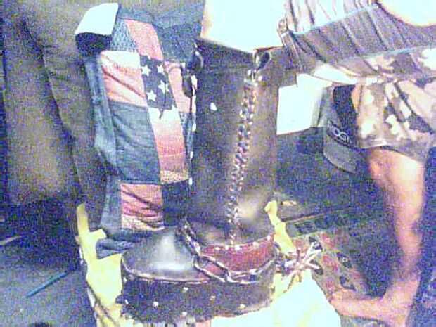 Las botas de estilo frankenstine que creó el año pasado. Usando a un viejo hasta las rodillas bloques patteren y 4 pulgadas x 13 pulgadas de mocasín de madera cortan en la forma de mi pie, {tamaño 13} para un efecto más alto. Forrado el interior con una lana de oveja sintético, para comodidad, agregadas cadenas, espigas y postes de madera, atado a ambos lados y usando herretes de diamantes que coloqué un 11 pulgadas alta cruzan en el frente de cada bota. También incorporé, {después destrozando una vieja comadreja jardín tuve} un par de aspecto medieval espuelas en los talones de cada bota así cada vez que entro, cada estímulo giros con cada paso que doy. Los fondos de cada bota tienen suela antideslizante de goma sacado viejas sandalias. Los combinan con el ratteling de las cadenas de let'um saben que yo voy y a hacerse a un lado. Los spurs se llevan a cabo en lugar por agujeros 1 pulgada ancho x 4 pulgadas largo profundo en la espalda a los bloques de madera, luego scured por tornillos y clavos líquidos. Los bloques son ligados por las correas del metal y rodeados de cuero correa de 9 oz con cemento de contacto y cabeza plana tornillos. Cada bota pesa aproximadamente 10 libras de más. Llevar este traje a un peso de gran total de 68 libras. Pero ya que el traje se distribuye por todo mi cuerpo, realmente siento que pesado me cuando lo lleva...