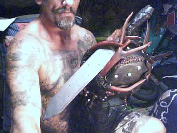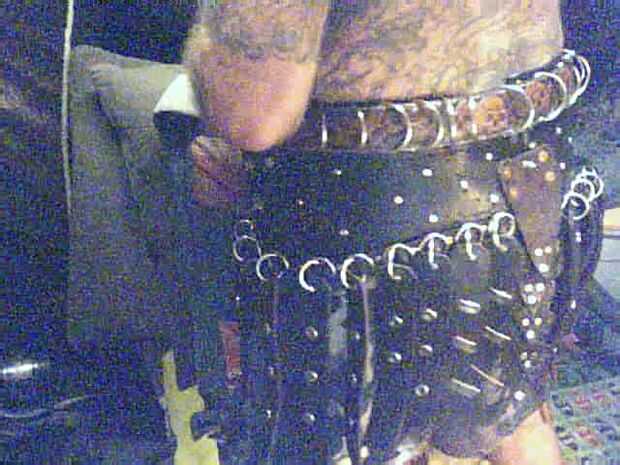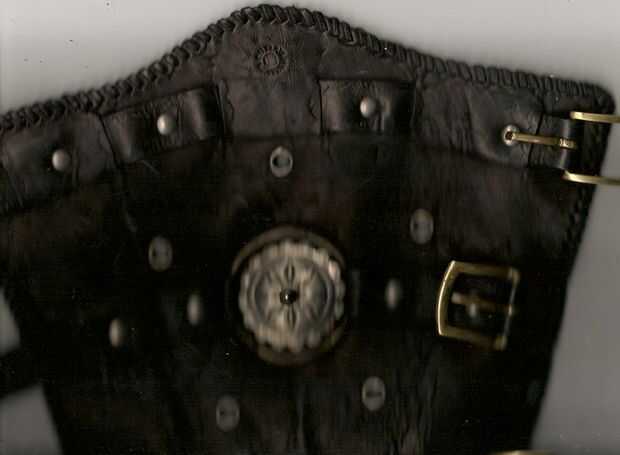 Altura total de este traje, desde la punta de los cuernos en la parte inferior de mis botas, me encuentro un enorme 6 pies 8 pulgadas. He utilizado innumerables remaches, anillos dee, picos, cemento de contacto, pegamento estupendo, tacos de todo tipo, ojales, conchos, hebillas, ciervo y cabra cuernos, cuero, medición de oz 2/3 7 / 9oz, ante, forro, encaje hecho en casa, tintes, perforan todos mis agujeros, mi cordón, cortar mis propio patterens y el proyecto intire me tomó sólo un poco más dos semanas tiempo total total , {pero durante un período de dos años} para terminar. Lo creas o no. Pero cuando has trabajado con cuero como tengo, entonces puede hacer cosas como esta. Todo lo que necesita es el material adecuado y un montón de imaginación.