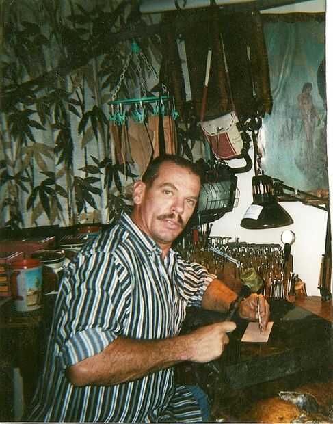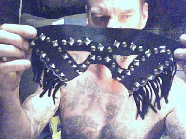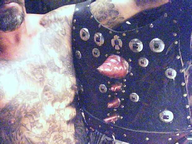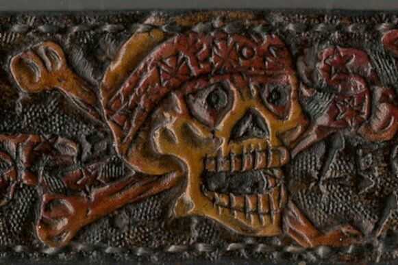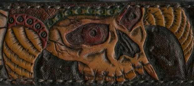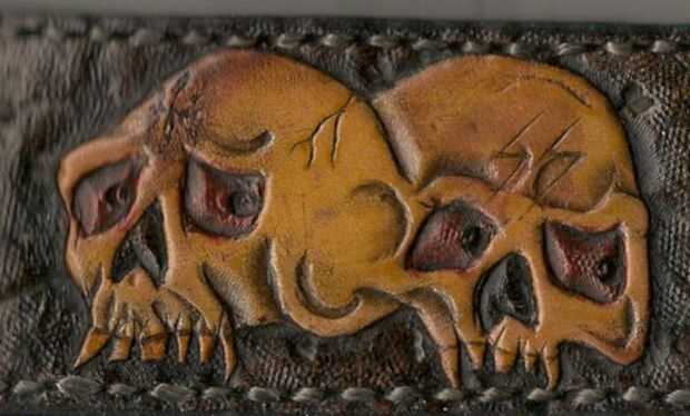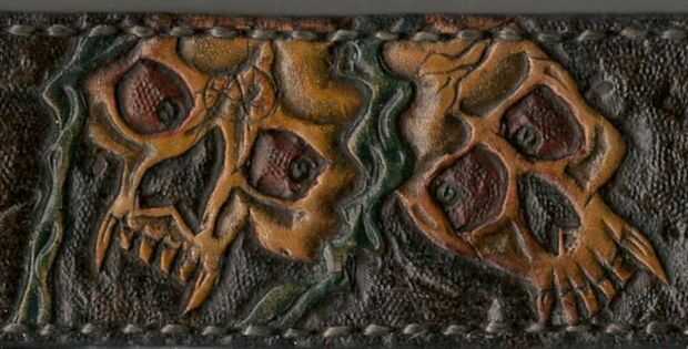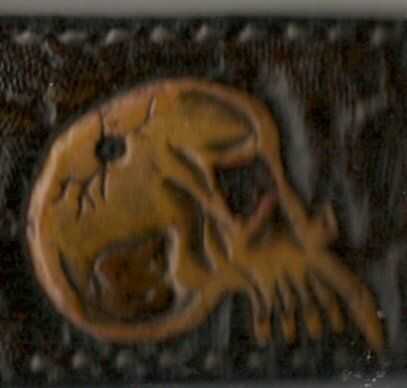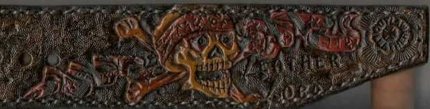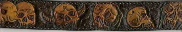 El cinturón es de 2 pulgadas de ancho y tiene 16 cráneos tallados en él con gran detalle y cada cráneo es totalmente diferente de la otra. En la lengua punta de la correa es mi logo de un screaming skull & crossbones. La hebilla que hice en 1987 cuando estaba en un programa de pasatiempo.
