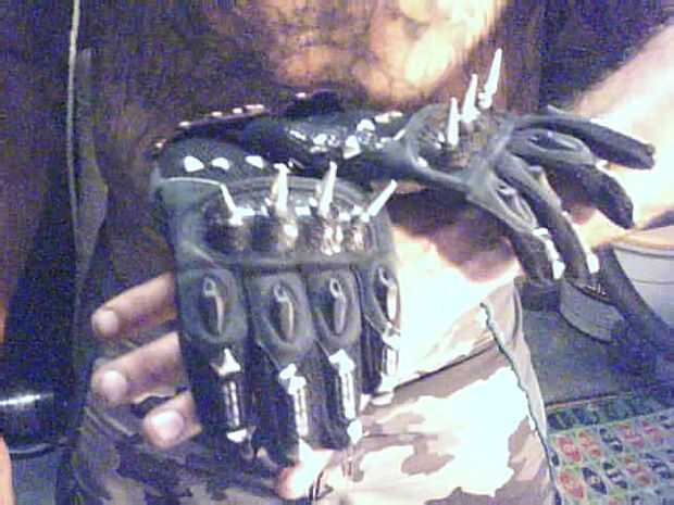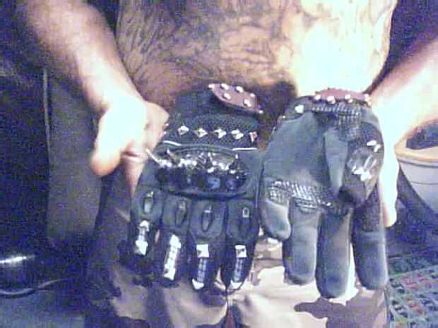 Los guantes son solamente un simple conjunto de guantes de motocross $20 que visten con espigas y postes de madera.