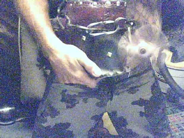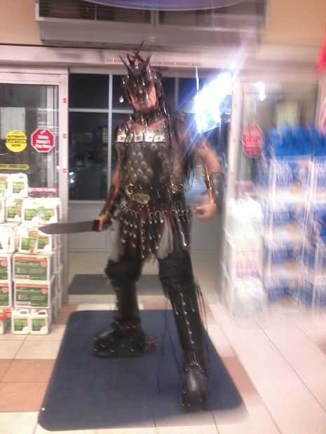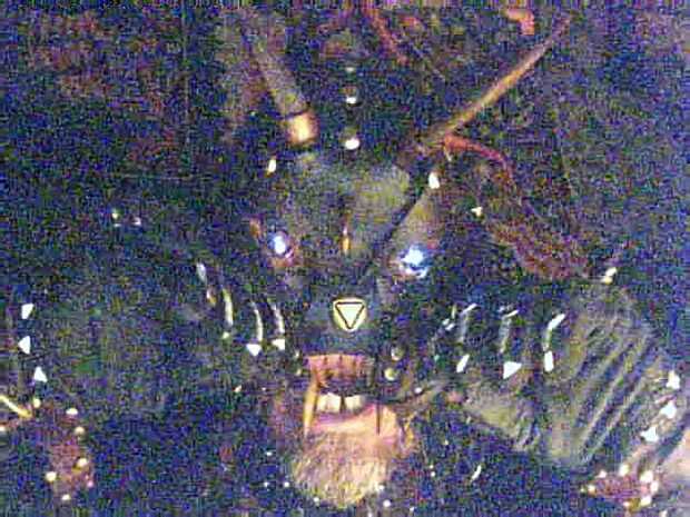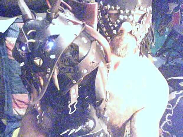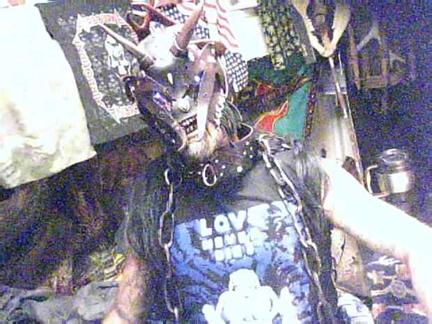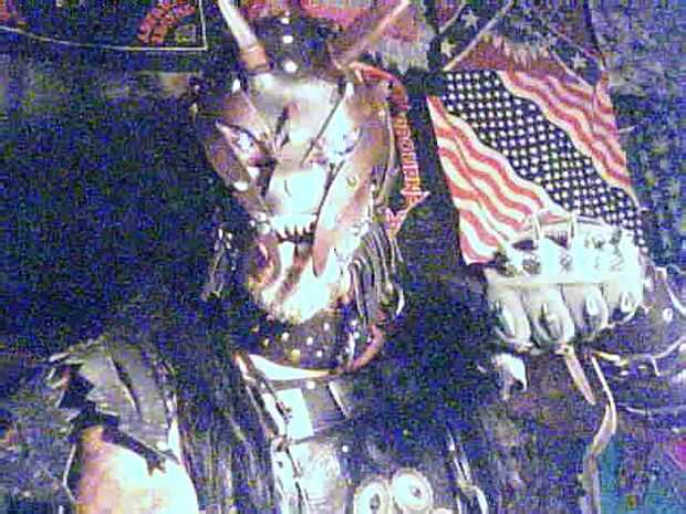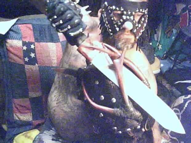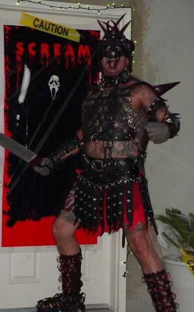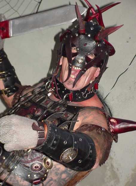 Lo 1 º comenzado con sólo un casco de moto y un par de cuernos de ciervo, que teñido rojo sangre de buey. El concepto del casco vino de la película, {gladiador, con Russell Crowe} cortar 4 pernos aligeramiento grandes, 2 en cada lado en la parte delantera. Cubrí el casco con cuero, atravesando los cuernos y trenzado sobre el casco con el cordón que hice y la adición de pernos, espigas, pelo, outter colmillos de puntas de cuerno, colmillos delanteros {dientes} había hecha de cuero y luces para los ojos que puedo cambiar y apagar solo por una película de mi cabeza. Las luces son mini Max dedo montado seguridad lites por {ionLite} que tienen un 3 Haga clic en configuración para flash constante, lento y rápido flash montado sobre mi visión de la vista. Luego construí una máscara interior con postes redondos y diamante, que va en mi cara primero bajo la máscara del casco. He añadido la franja negra sacada de una vieja chaqueta de ante para un efecto barba. El tema entero detrás de este traje es {el relámpago Bolt} como se puede ver en cada pieza del traje. El largo pelo negro es de una peluca que encontré que alguien tiró. También pasa a ser pelo verdadero. Lo guay es que...