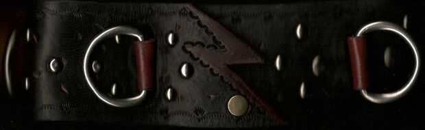 La falda inferior consisten en 2-20 x 8 pulgadas pedazos de cuero de 8/9 oz que se doblan alrededor de mis caderas y 24 x 14 ancho, 1 1/2 pulgada de la pulgada largo borlas de cuero, cada uno con un perno de relámpago cortar las puntas. Los pernos de relámpagos fueron teñidos de rojos mientras que el resto de la falda fue teñido de carbón negro. Usé los anillos dee para lazos de la correa, así como fijar las borlas inferiores.