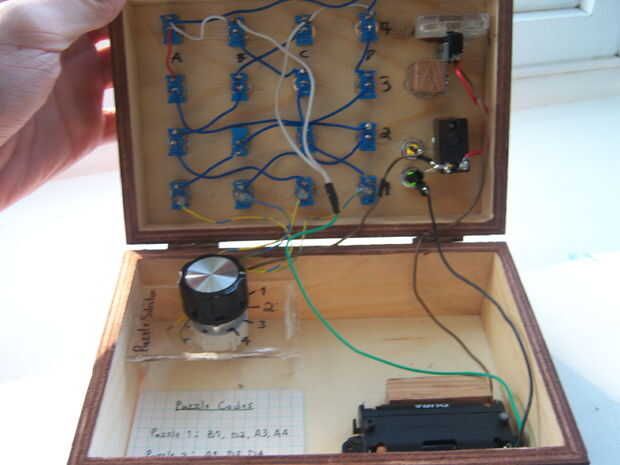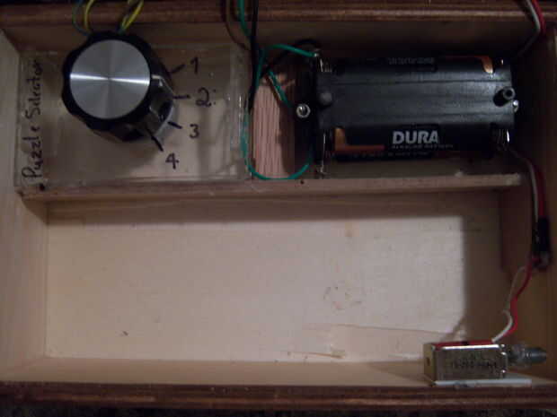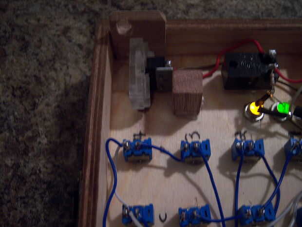 Ahora he agregado un dispositivo de bloqueo en forma de un solenoide. Cuando el ámbar que LED se ilumina, el solenoide atrae su émbolo de la "cerradura" (una pieza de MDF con un agujero) y se abre el cuadro. He actualizado las imágenes para mostrar este cambio.