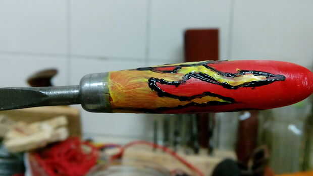 usé una herramienta de pintura de línea especial para hacer los contornos de las llamas con pintura negra.
