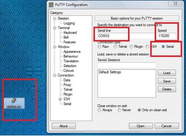 Seleccione Serial >> entrada velocidad 115200 >> entrada línea serie como COMxx (cambio xx con su número de COM)
