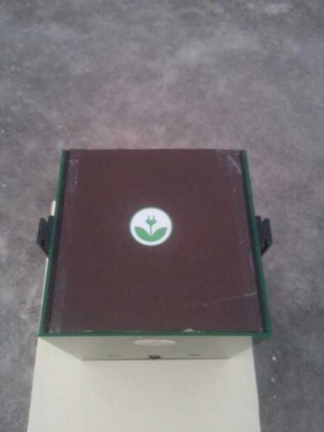 El cubo verde es un cubo de generación de energía renovable portátil como estructura que aprovecha la electricidad de la célula solar, generador de crancked de mano y dos pequeños molinos de viento.