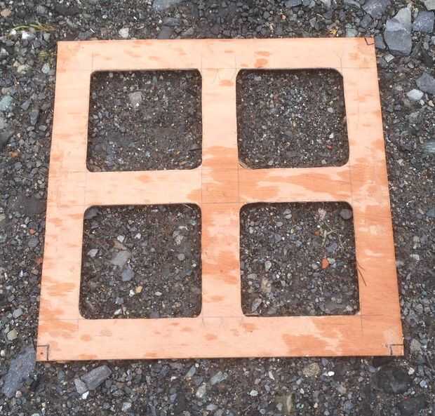 - Hay 2 de 460 x 460 x 5 hojas de madera contrachapada que se muestra en el dibujo ampliado y la parte superior uno se sujeta a la caja principal, mientras que la parte inferior, uno simplemente descansa debajo de la malla, creando un sándwich.