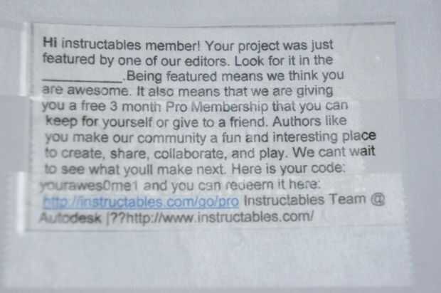 Felicidades, el proyecto sólo ha aparecido por uno de nuestros editores. Ser destacados medios pensamos que es impresionantes! Usted califica para un mes tres miembros Pro. Recoger tarjeta de recompensa de instructables, bucks Bot y seguir adelante.