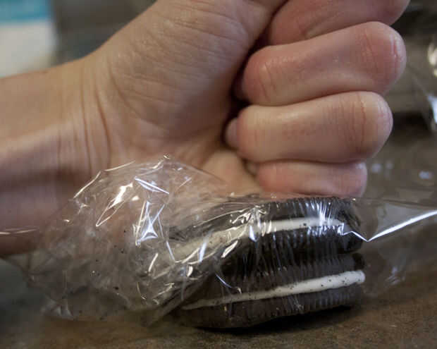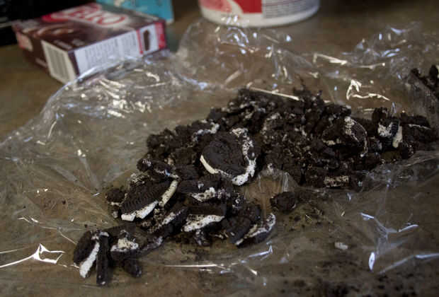 Paso 6: Obtener una bolsa o saran wrap y colocar cinco galletas Oreo dentro. SMASH.