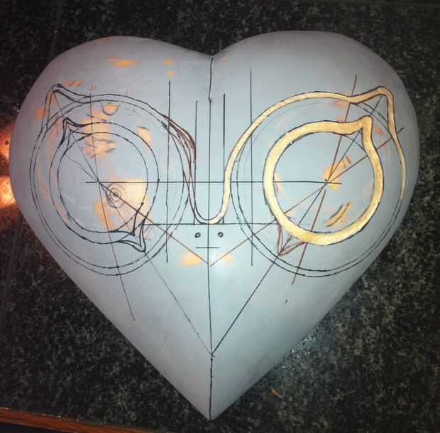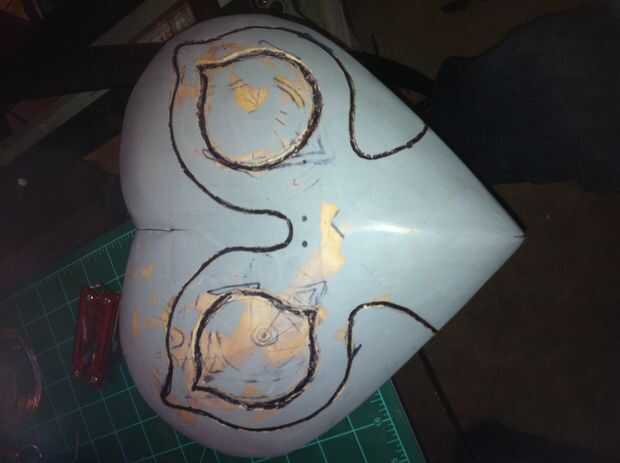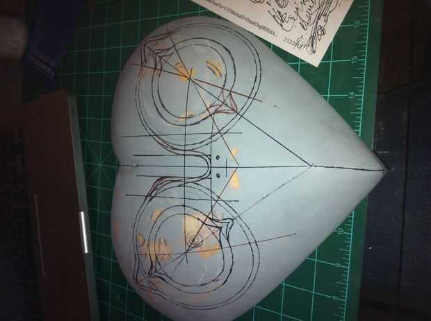 Después de la máscara ~ 24 horas para secar, pasé algún tiempo de calidad con mi Sharpies, gobernantes, y mi fiel brújula para trazar meticulosamente los detalles de los ojos y el entorno levantado áreas. Usé la imagen digital de la máscara de Majora en carrete de foto de este paso para la totalidad de la colocación de la característica. Después de que había trazado donde todas las características fueron que se encuentra, puse un poco de lápiz de bola en mi Dremel y cortar a mano alzada muy poco profundos canales entre mis líneas de Sharpie-d. Me puse un poco marcador-feliz y lleno en todas las líneas que yo sólo había cortados, como usted puede ver en la imagen.