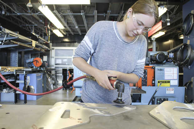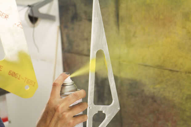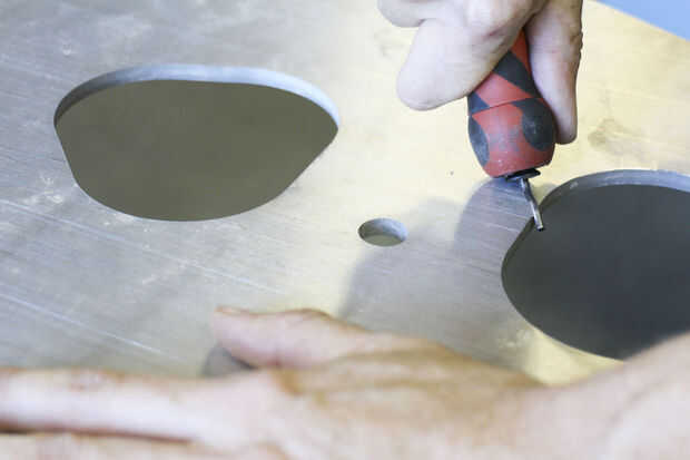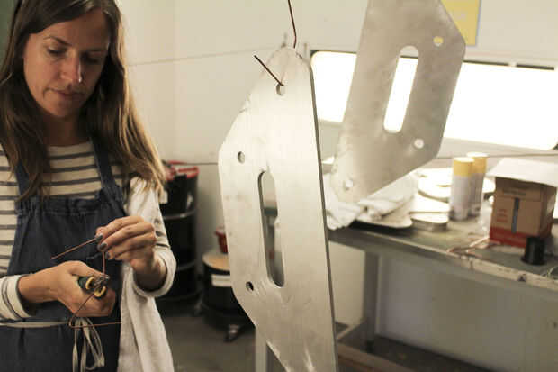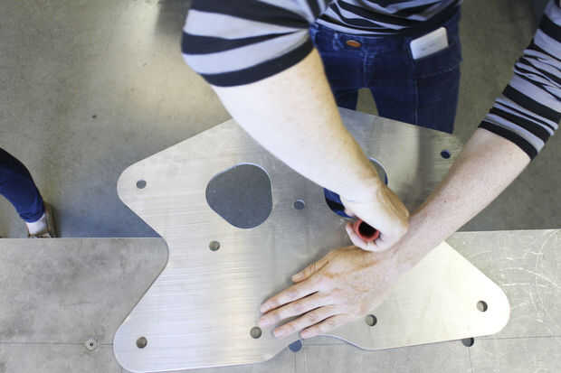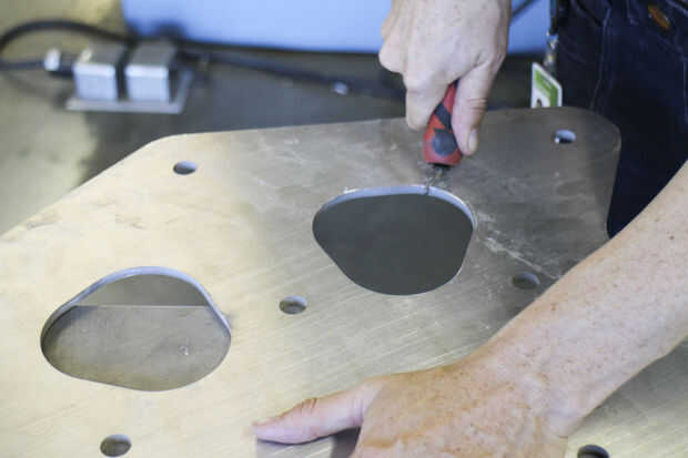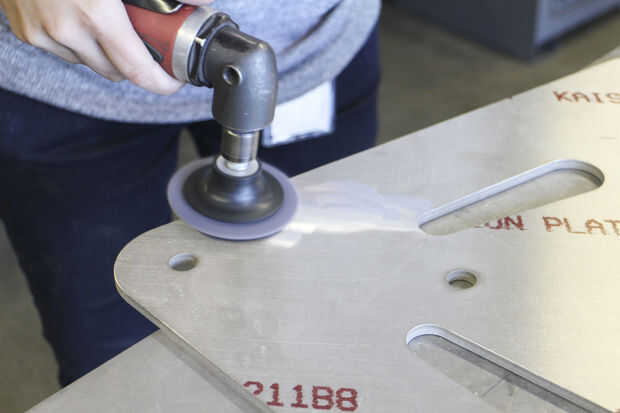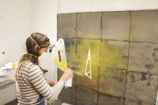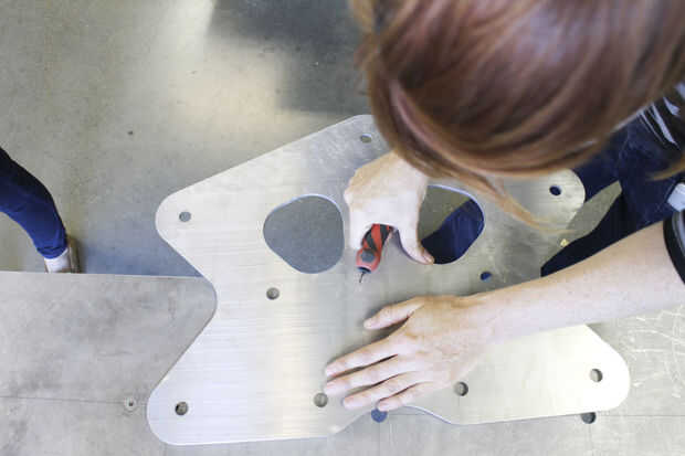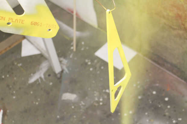 Este trabajo fue realizado principalmente por Paige Russel y Madeleine Douglas (nuestro segundo interno). Paige había servido (womanned?) el chorro de agua, MikaelaHolmes hizo el quitar las rebabas, Maddie limpia las marcas con acetona y me los pedacitos difíciles con una rueda de la aleta. Paige hizo la mayor parte de la pintura-fuimos con Rustoleum amarillo brillante para los refuerzos para que coincida con la azul las paredes en el espacio.