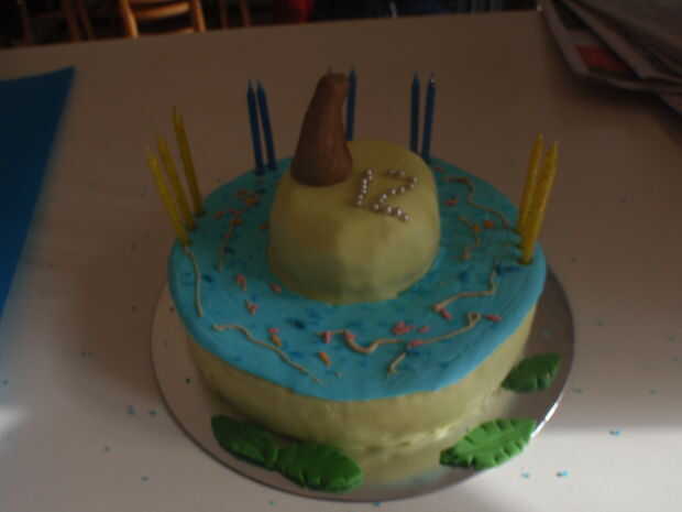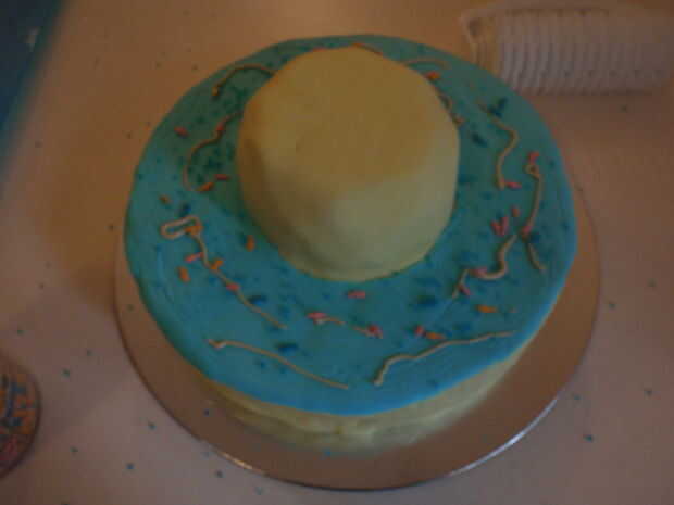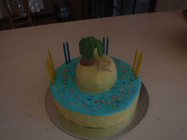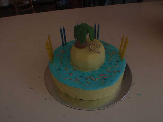 Hi! Hice esta tarta para mi hermano pequeño y es con temas del océano. Hay una isla en el medio y un océano con olas, peces y cristales alrededor de la parte I servicio de algunas "algas" en la orilla. El pastel dentro es chocolate e hice todos los decos con glaseado real, aparte de las cosas vivo. La palmera era más difícil de hacer, porque no endurecen las hojas, por lo que les había apuntalado con algunos "cocos". Espero que les guste!!! (Si bastante gente decir, voy a añadir las instrucciones)