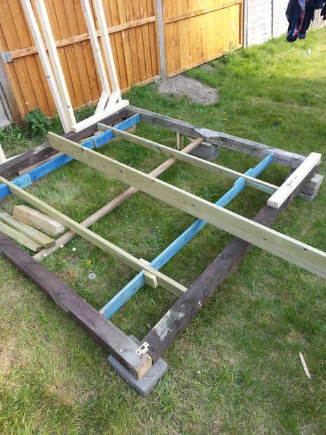 Decidí a tope los puestos juntos y luego añadir mi "vigas" por el medio que utilicé 2 tableros de cubierta, uno de ellos partirse por la mitad y luego el otro como un todo en el medio, utilicé unos tirantes metálicos para mantener en su lugar pero también hice muescas para ellos en. En esta foto aún no he terminado la mitad de la estructura pero es la imagen solo que tengo...