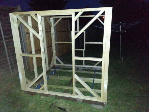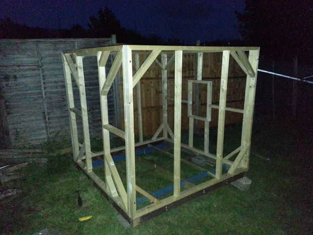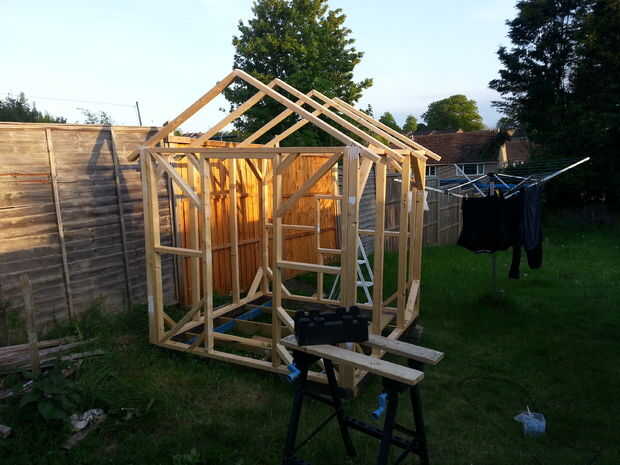 Después había dejo el pegamento de madera secando y hecho Asegúrese de que el marco inferior era lo suficientemente fuerte como para sostener mi cuerpo entonces utilicé algún entrenador pernos para empérnela juntos que creo que terminó con cerca de 25 pernos con arandelas, fueron galvanizados por lo que debe sostener hacia fuera contra la intemperie. He añadido la parte del techo después de que había montado la estructura he utilizado un tono de 30 grados creo que no recuerdo exactamente pero inglete la parte superior y cortar ranuras para la pared lateral. Me pongo en 4 listones en el techo, no añadir cualquier madera entre ellos pensó, pero decidió esperar y ver después agregué las tablas más adelante y si es necesario agrega más adelante.