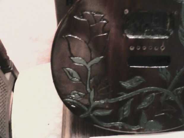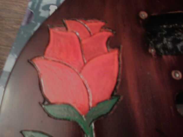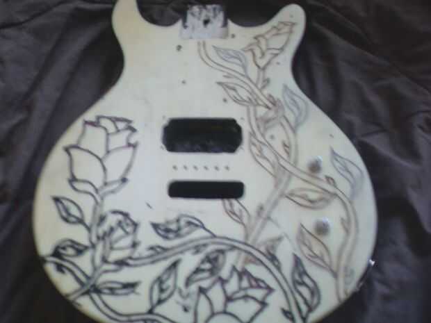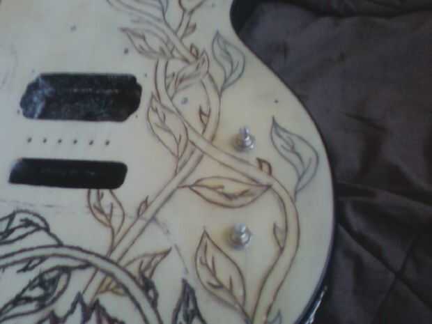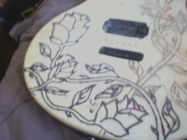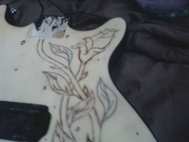 una vez que tengas en la guitarra uso una estufa de leña y traza sobre el diseño para que se quema en la guitarra, (empujar hacia abajo en la madera con el quemador como traza el diseño, usted puede decidir en la profundidad por la presión se utiliza)