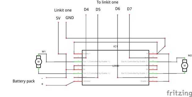 El circuito que hice usa L293d. El papel de este IC es recibir señales de linkit uno y los motores por consiguiente. Deberá hacerse constar que necesita utilizar otra batería aparte de la un batería linkit para alimentar los motores porque la batería de litio es demasiado débil para realizar esta tarea.